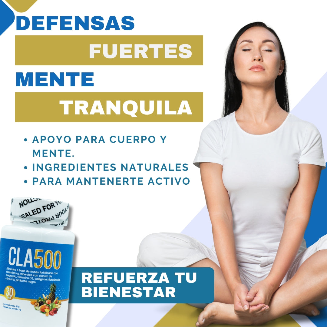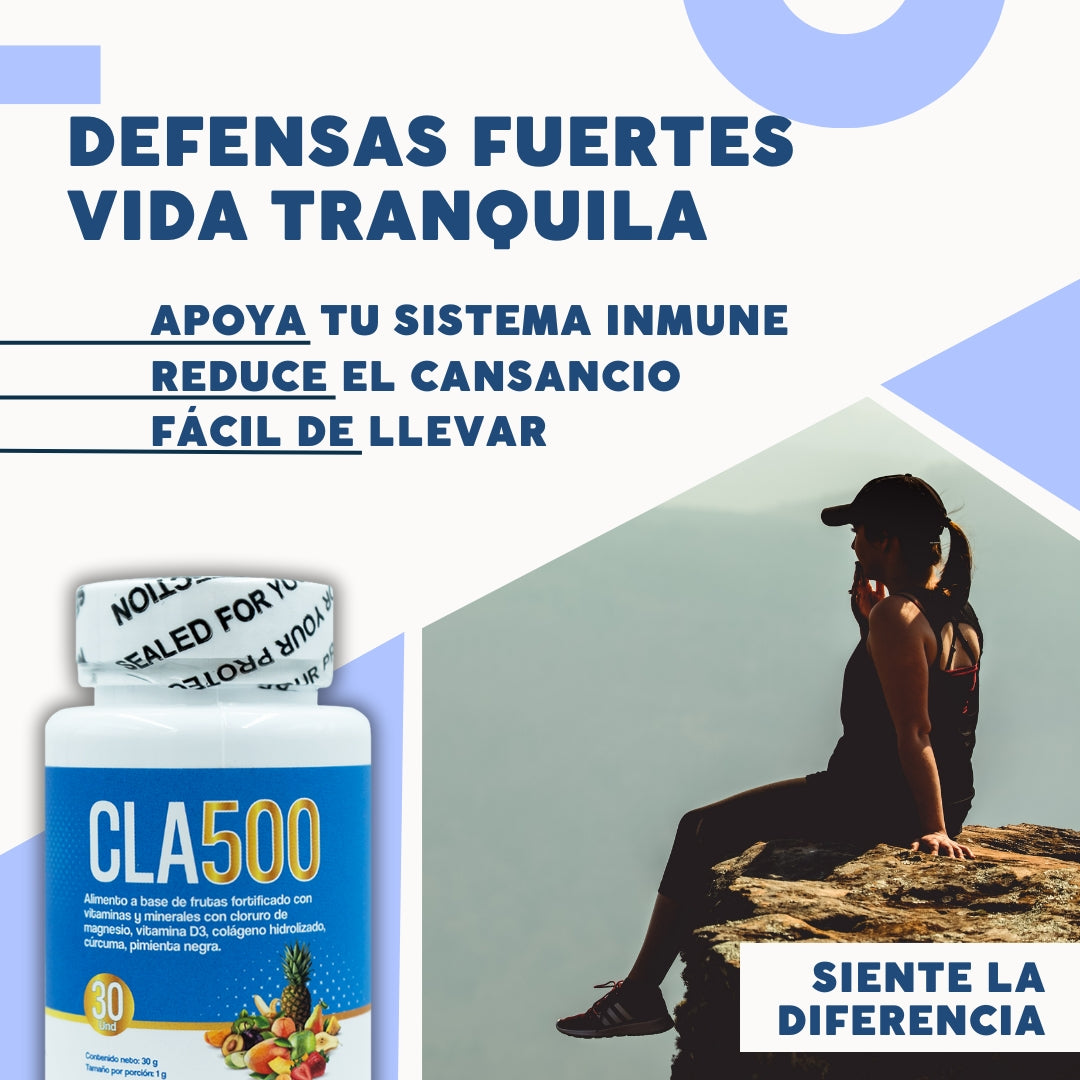 Elige CLA500 y da el primer paso hacia una vida más saludable y activa. Nuestro compromiso es brindarte un producto de alta calidad, registrado por INVIMA (RSA-0031426-2024), que apoya tu bienestar integral. ¡Transforma tu salud hoy mismo!