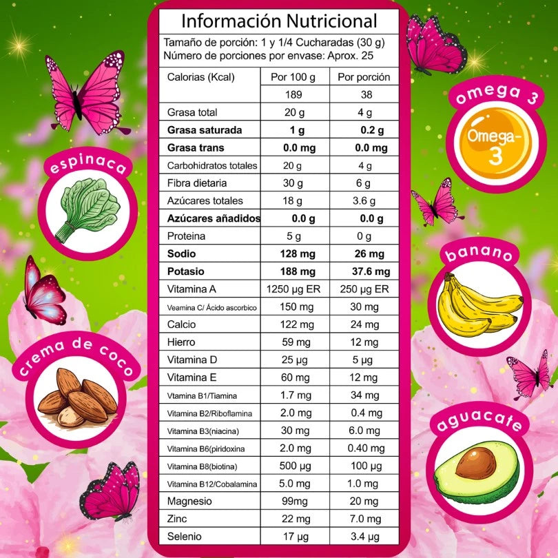 Crema de coco, Proteína de suero de leche, Proteína de arveja, Banano, Manzana, Aguacate, Fresa, Espinaca, Manzana, Linaza molida, Pepino, Piña, Pimienta, Cúrcuma, Avena, Mezcla de Vitaminas y Minerales.